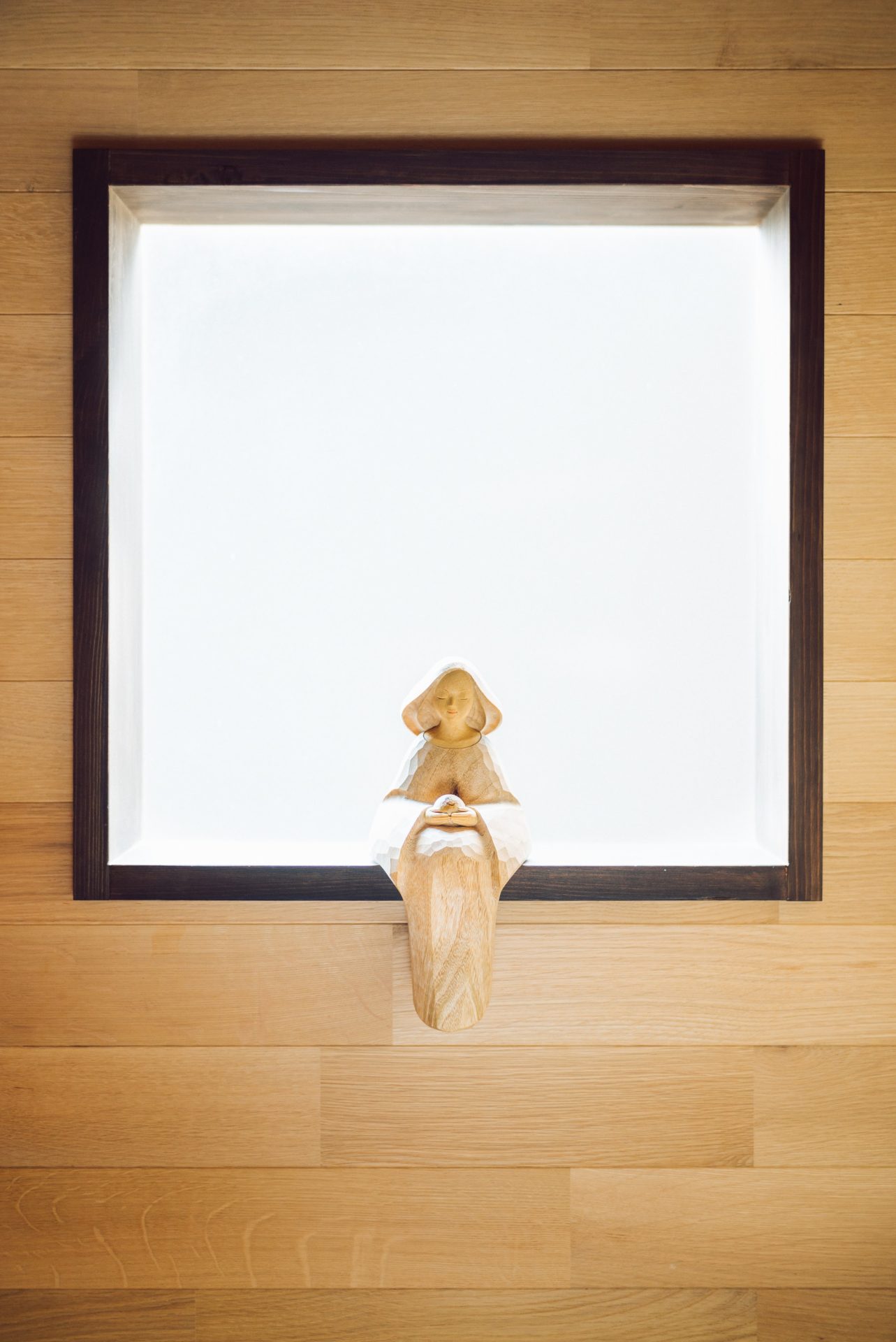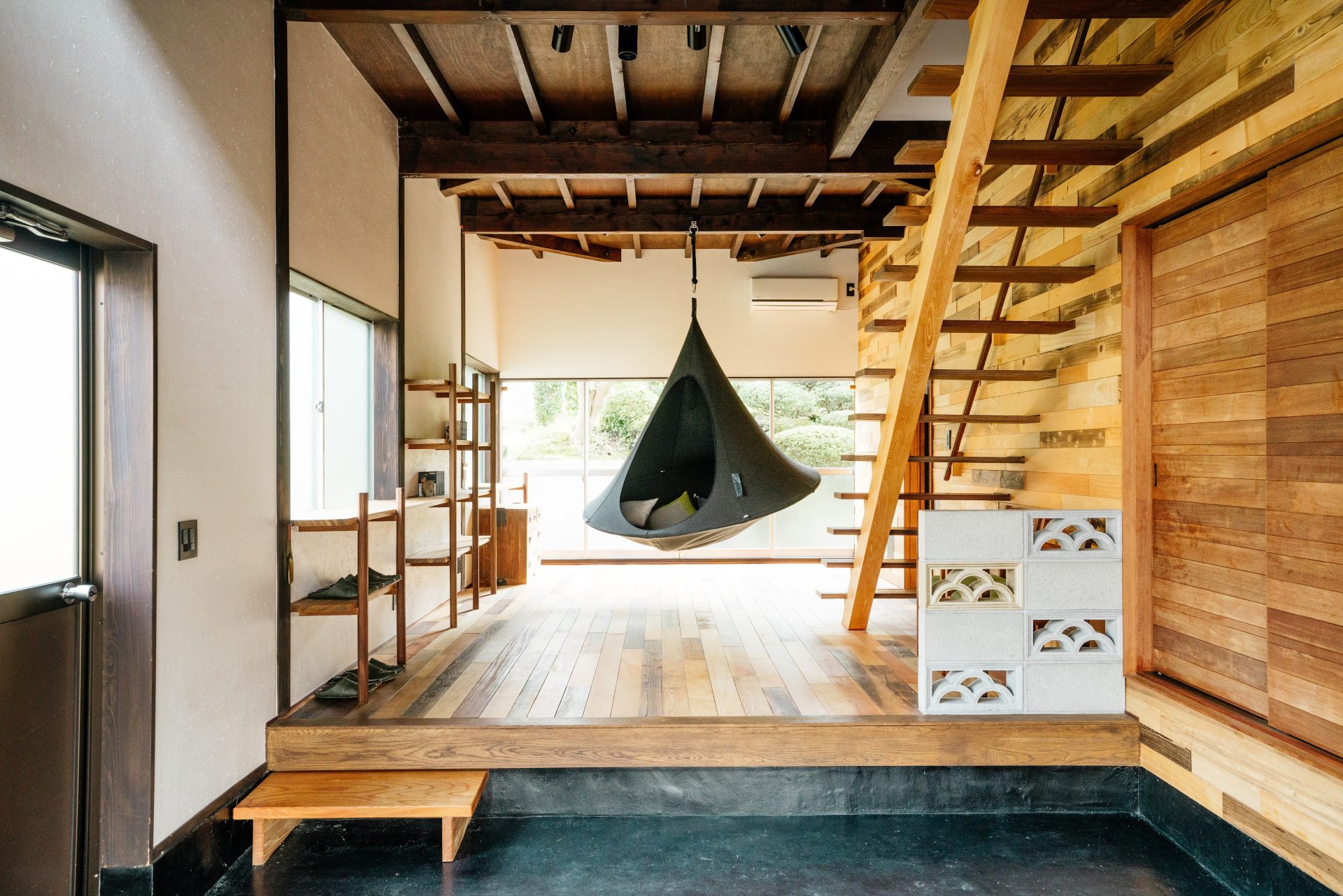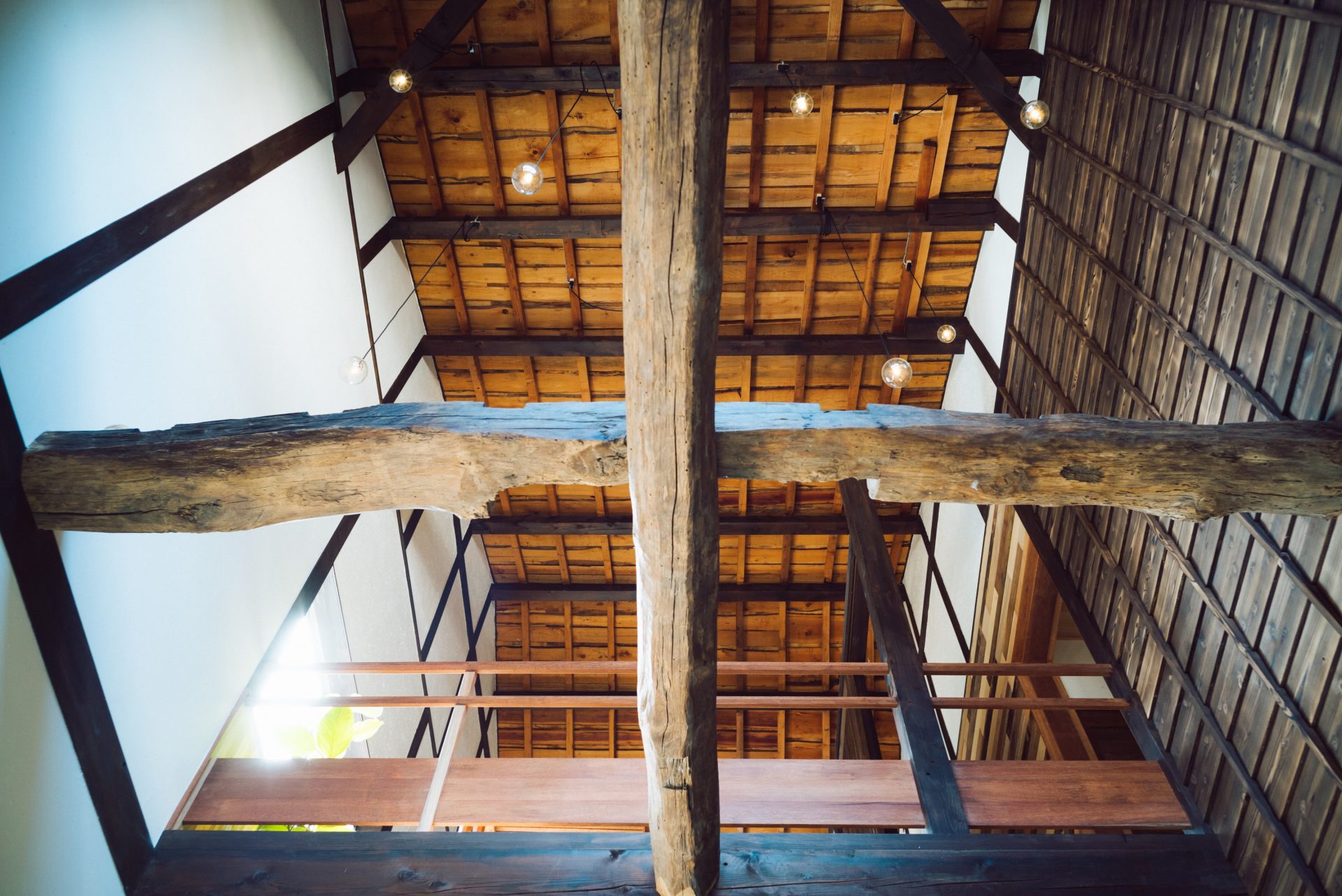 ここは職人の町。この建物も建具屋の工房でした。築五十年の時の流れを感じ、あたらしさも感じるデザイン。いたるところに建具屋のエッセンスを散りばめました。さらに彫刻家・田中孝明の作品を展示。木の香りを感じ、職人のしごとに触れる宿。井波らしさを感じられます。