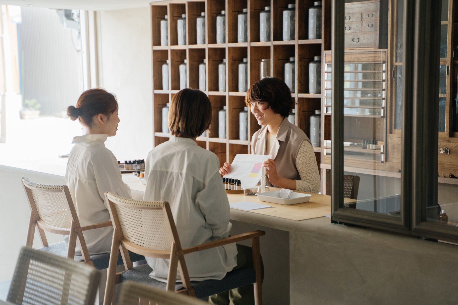 ラウンジスペースで、ティータイム。スタッフが、レシピに沿ったブレンド精油をその場で製作します。(オリジナルのラベルに記入したり、ティータイムを楽しみながら20〜30分お待ちください)