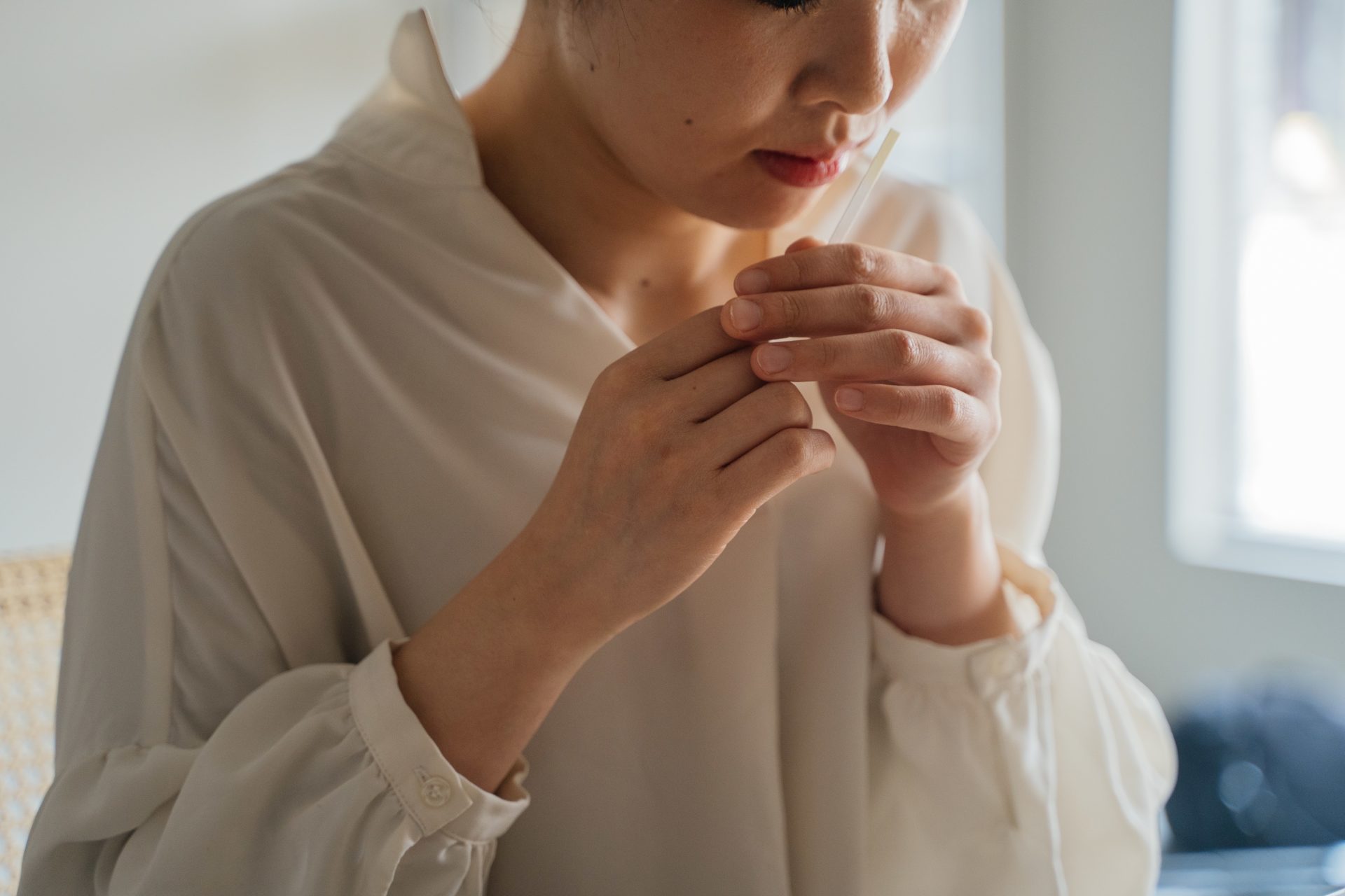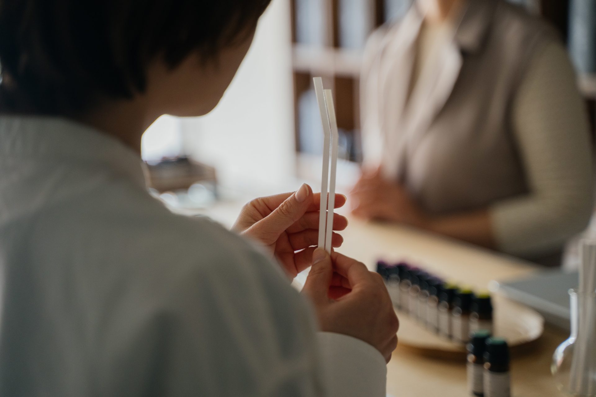 香りをテイスティング。テーマに沿った好きな精油を3種類選びます。